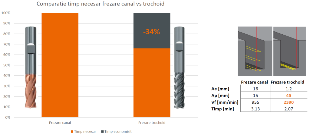 Economia de timp obținută la frezarea unui canal lățime 20 mm, adâncime 45 mm, cu metoda trohoidală este de 34%