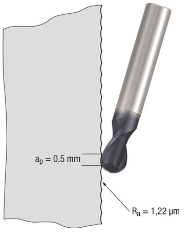 Prelucrarea suprafețelor 3D reprezintă întotdeauna o provocare pentru că rugozitatea suprafeței obținute depinde în mod direct de raza sculei sferice. Știm că, în general, este indicat să se lucreze cu o sculă sferică cu raza cât mai mare, pentru ca distanța dintre trecerile succesive ale frezei să fie și ele cât mai mari, reducând astfel timpii de prelucrare. Deși se obține un timp de lucru mai scurt, trebuie să ținem cont că raza sculei este limitată la R10-R16 mm din cauza formei și gabaritul suprafeței de prelucrat, dar și din cauza sistemul de prindere a frezei. Din aceste motive, este imposibil de folosit o sculă sferică cu raza mai mare, de exemplu R100.